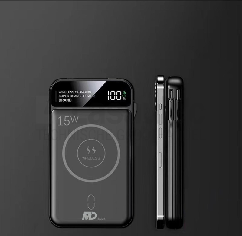 | Powerbank MD Blue 468 Wireless 10000 mAh 15W zwart met 3 laadkabels • display met batterijpercentage • 1 x USB Out / 1 x Type C Out / 1 x Micro USB Out / 1 x 8-Pin Out • 1 x USB / USB-C laadkabel voor Powerbank • 1 x geïntegreerde USB-C laadkabel • 1 x geïntegreerde 8-pin laadkabel |
