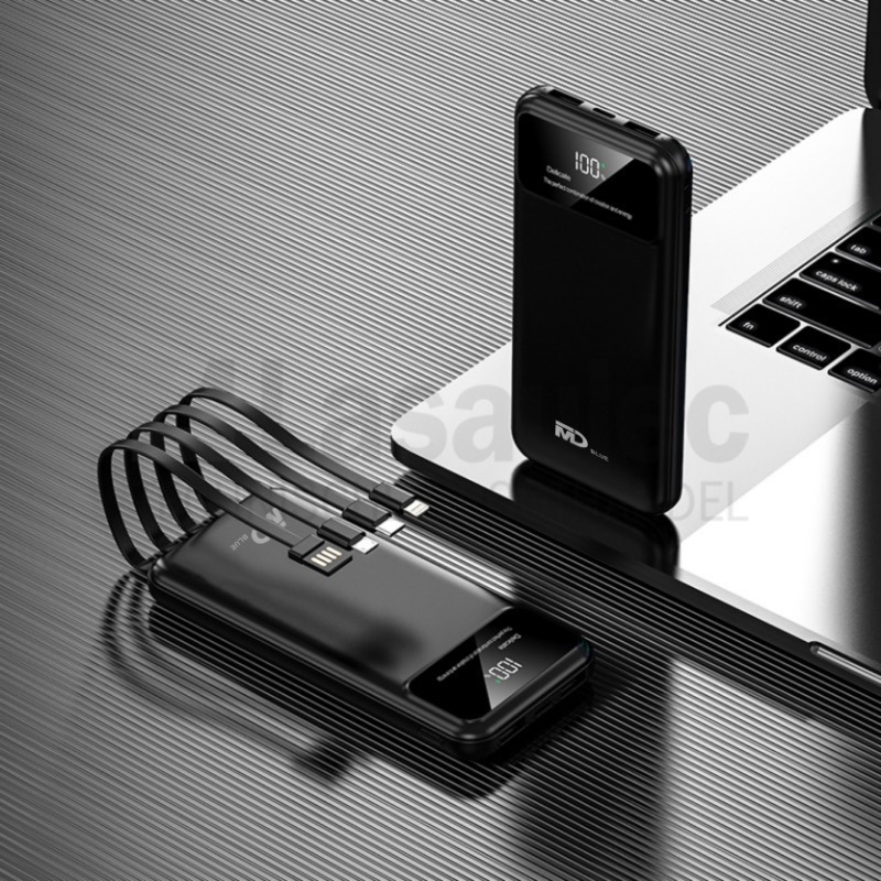 | Powerbank MD Blue 589 10000 mAh zwart 5 laadkabels • display met batterijepercentage • 2 x USB Out / 1 x Type C In/Out • 1 x geïntegreerde USB laadkabel • 1 x geïntegreerde Micro-Usb laadkabel • 1 x geïntegreerde USB-C laadkabel • 1 x geïntegreerde 8-pin laadkabel • 1 x USB / USB-C laadkabel voor Powerbank |