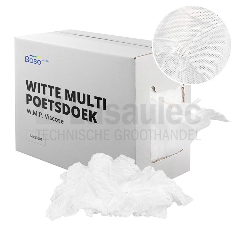 De witte multi poetsdoek viscose is een non woven doek van viscose / polyester kwaliteit met gaatjes structuur. Voor specifieke toepassingen, waarbij gevraagd wordt naar een pluisarme, sterke, absorberende en oplosmiddelbestendige doek, is dit een uitstekende doek. Door de enorme hoeveel doeken per kilo is het economisch in gebruik, hetgeen ook een besparing op de afvalkosten oplevert. In te zetten om olie, koolwaterstoffen en vet te verwijderen. Minder geschikt voor absorptie van water.