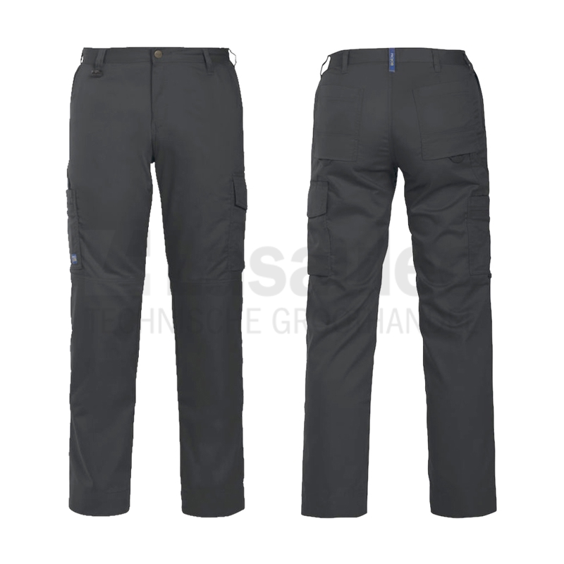 Werkbroek, dames model, vervaardigd van lichtgewicht polyester katoen met kniezakken aan de binnenkant. Verder voorzien van twee zijzakken, de rechter met ritssluiting, twee dijbeenzakken: linker met klep met apart telefoonzakje binnenin; rechter met verschillende compartimenten voor o.a. potloden, duimstok, twee ruime achterzakken en D-ring vooraan.