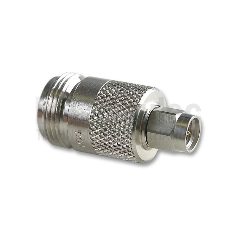Radiall coax connector koppeling bus/steker, bouwvorm recht, connectortype N/SMA, impedantie 50Ohm, beschermingsgraad (IP) IP30, adapt. SMA male / N female.