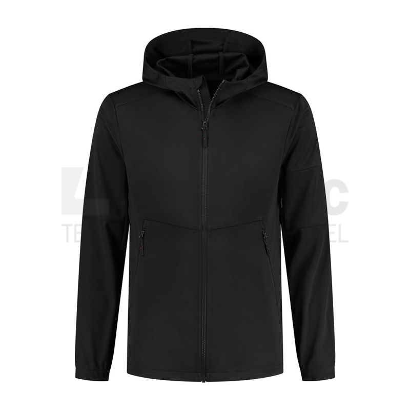 Softshell jacket, 100% polyester, 180 gr/m2, 3-laags lichtgewicht softshell jacket met verstelbare capuchon, zak op linkermouw in naad verwerkt, steekzakken met rits, YKK ritssluiting, onderzijde verstelbaar met koord en koordstopper. Alle naden aan de binnenkant zijn afgewerkt met mesh band. Winddicht, waterdicht 5000mm water column 5000 Gr/m2 en 24h ademend.