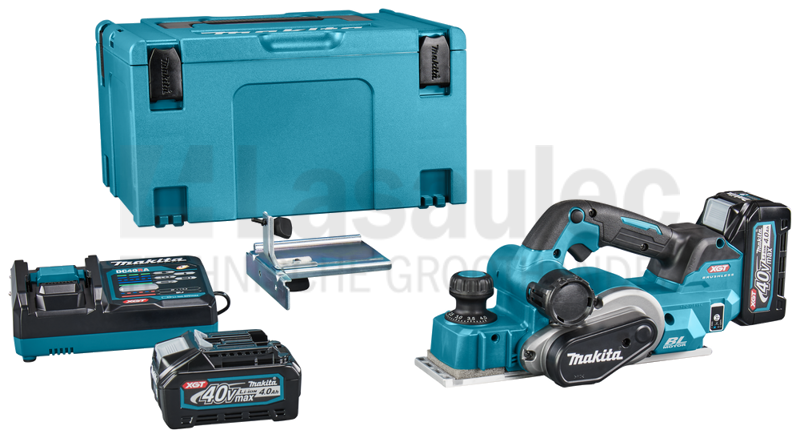 M-box met 2 accu's 40V - 4 Ah, een snellader XGT DC40RA, Schaafbeitel afstelmal 82mm, Parallelgeleider, Dopsleutel schaaf 9mm, HM schaafbeitels 82mm en een Dieptegeleider. KP001GM201
