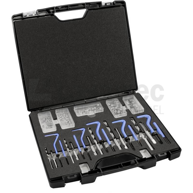 Schroefdraadreparatieset bestaande uit 5 boren, 5 tappen, 5 draadinzetters, 5 draadlipbrekers en diverse coils.