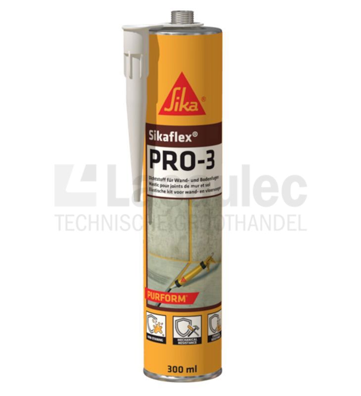Sikaflex® PRO-3 Purform® is een 1-component, vochtuithardende, elastische polyurethaan kit. Het dicht vele soorten voegdimensies af in vloeren en civieltechnische constructies. De elasticiteit blijft over een breed temperatuurbereik behouden en de hoge mechanische en chemische bestendigheid zorgt voor een goede duurzaamheid.