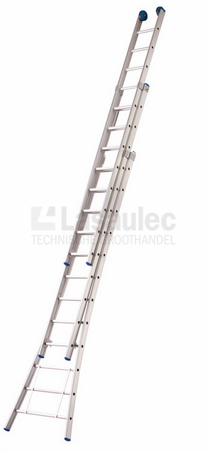 Driedelige bouwladder met uitgebogen voet. VGS en Warenwet gekeurd.