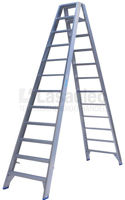 Industrietrap vervaardigd uit aluminium, bestaande uit twee trapgedeelten. De trap is voorzien van een scharnierend platform voor industrieel gebruik, extra gelaste versteviging onderaan, veiligheidsbeugel en extra beveiliging tegen spreiden en toeschuiven via tweede scharnierplatform. Extreme buitentemperaturen worden gedeeltelijk geneutraliseerd door de polyester coating, die tevens voor minder vuile handen zorgt.
