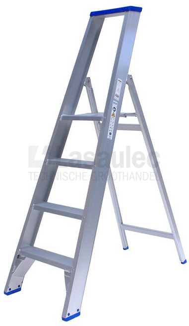 Industrietrap vervaardigd van aluminium, bestaande uit één trapgedeelte en één steungedeelte. De trap is voorzien van een kunststof gereedschapsbakje bovenaan, een scharnierend platform voor industrieel gebruik en extra gelaste versteviging onderaan. Extreme buitentemperaturen worden gedeeltelijk geneutraliseerd door de polyester coating, die tevens voor minder vuile handen zorgt.
