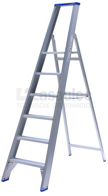 Industrietrap vervaardigd van aluminium, bestaande uit één trapgedeelte en één steungedeelte. De trap is voorzien van een kunststof gereedschapsbakje bovenaan, een scharnierend platform voor industrieel gebruik en extra gelaste versteviging onderaan. Extreme buitentemperaturen worden gedeeltelijk geneutraliseerd door de polyester coating, die tevens voor minder vuile handen zorgt.