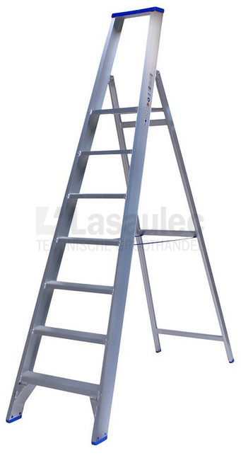 Industrietrap vervaardigd van aluminium, bestaande uit één trapgedeelte en één steungedeelte. De trap is voorzien van een kunststof gereedschapsbakje bovenaan, een scharnierend platform voor industrieel gebruik en extra gelaste versteviging onderaan. Extreme buitentemperaturen worden gedeeltelijk geneutraliseerd door de polyester coating, die tevens voor minder vuile handen zorgt.