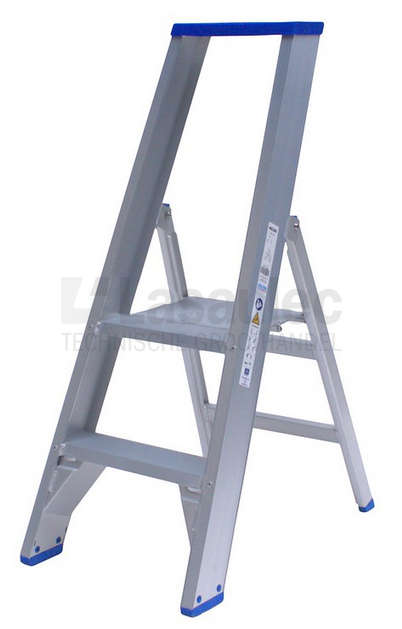 Industrietrap vervaardigd van aluminium, bestaande uit één trapgedeelte en één steungedeelte. De trap is voorzien van een kunststof gereedschapsbakje bovenaan, een scharnierend platform voor industrieel gebruik en extra gelaste versteviging onderaan. Extreme buitentemperaturen worden gedeeltelijk geneutraliseerd door de polyester coating, die tevens voor minder vuile handen zorgt.