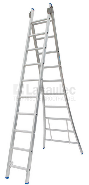 Tweedelige reformadder voorzien van uitgebogen voet. Uitschuifbaar, mogelijk uiteen te nemen en om te vormen tot dubbele ladder. Bij gebruik als trap (dubbel gezet), de ladder bestijgen aan de zijde waar de sporten horizontaal staan.