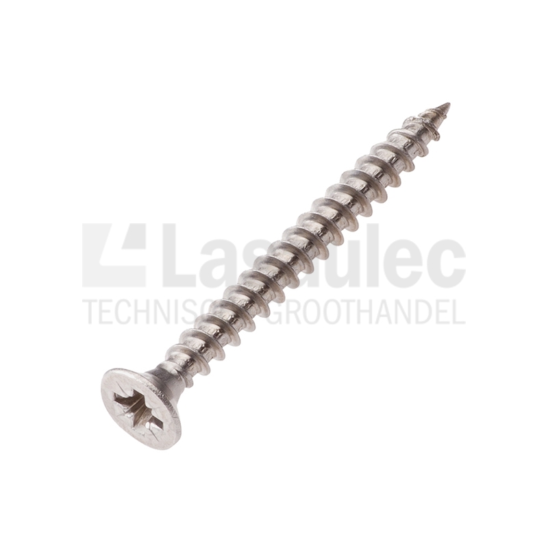 Spaanplaatschroef voorzien van verzonken kop met Pozidriv 2 aandrijving.