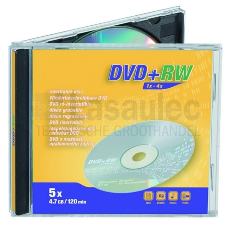 DVD-Rewritable met een capaciteit van 4,7 Gb in jewel cases.