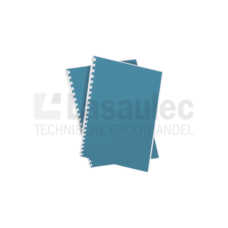 Voorbladen blauw lederlook vervaardigd uit karton, voor het inbinden van documenten. De bladen zijn niet geperforeerd.