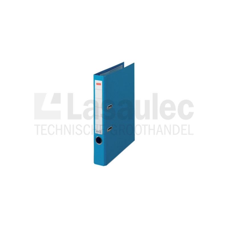 A4 ordner vervaardigd uit met polypropyleen omtrokken (buiten- en binnenzijde) karton, voorzien van drukspanner, sleufgaten in het voorplat, vernikkelde rugring en metalen randbescherming aan onderzijde ordner. Inclusief indexblad en venster met verwisselbaar rugetiket.