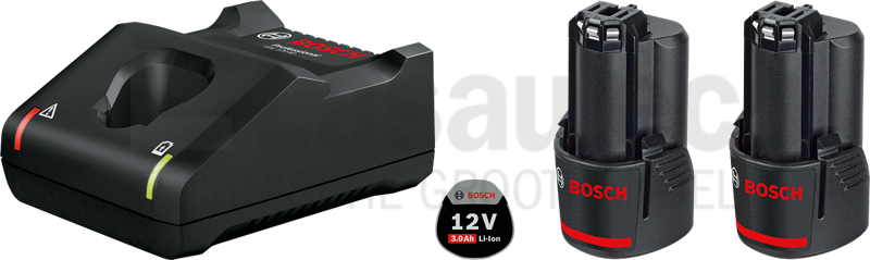 Startset bestaand uit 2 x 12V-accu met een capaciteit van 3,0 Ah en snellaadapparaat.