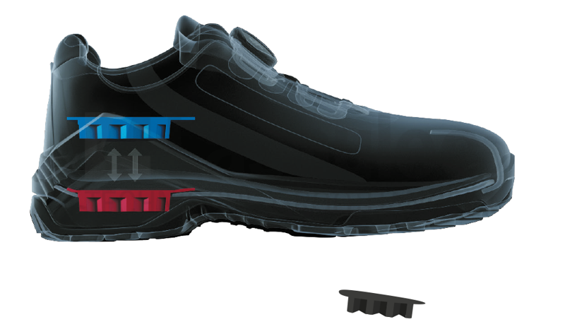 Veiligheidsschoenen met het SECURA VARIO® systeem en schokabsorptie zijn mild voor de rug. Het vervangbare, gewichts- en drukafhankelijke SECURA VARIO®-schokabsorptiesysteem bij de hiel zorgt voor demping die is aangepast aan de individuele behoeften van de drager. De drukbelasting in de schoen wordt op natuurlijke wijze verminderd en zorgt voor een gerichte ontlasting van de rug. Tegelijkertijd helpt het gewichtsafhankelijke SECURA VARIO®-schokabsorptiesysteem de vermoeidheid aanzienlijk te verminderen en vergroot het de mogelijkheid om drukbelastingen door de been- en rompspieren te compenseren.