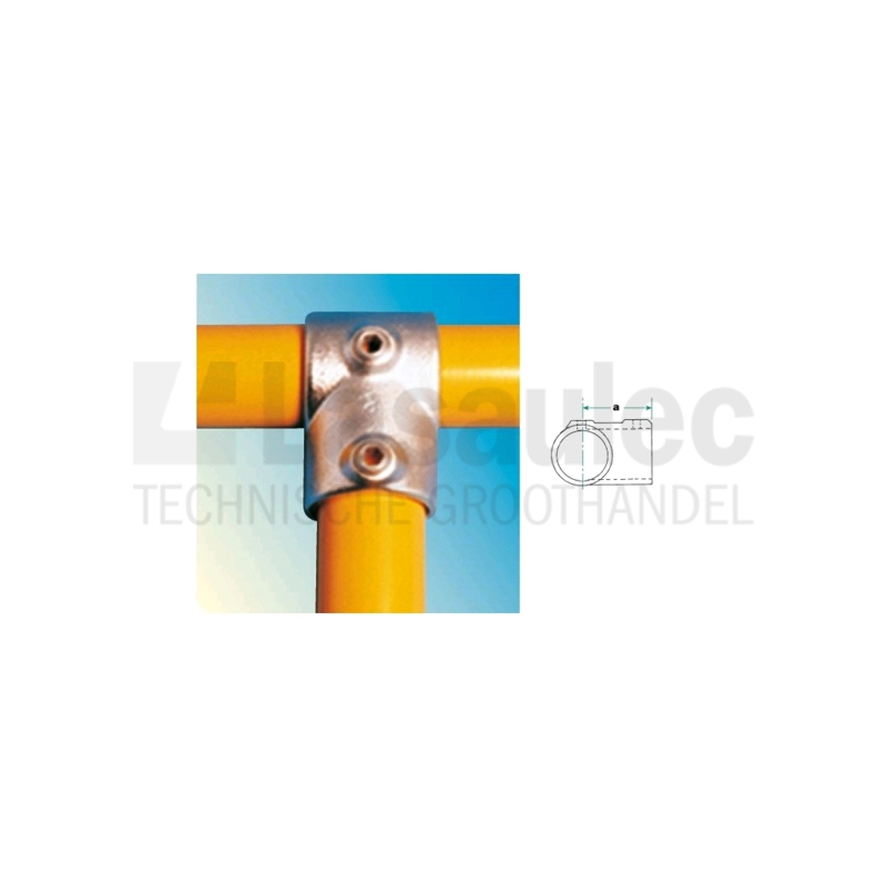 Buisklem voor het maken van een vaste verbinding van 90° tussen twee buizen. Als er twee buizen gekoppeld moeten worden in de doorgaande verbinding dan wordt type 104 (lang T-stuk) gebruikt.
