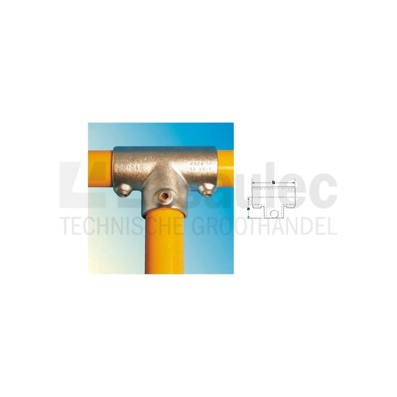 Deze buisklem kan worden gebruikt om een vaste verbinding van 90° te maken tussen twee buizen. Er zitten in de doorgaande verbinding twee inbusbouten waardoor de koppeling gebruikt kan worden op plaatsen waar ook twee buizen aan elkaar verbonden moeten worden.
