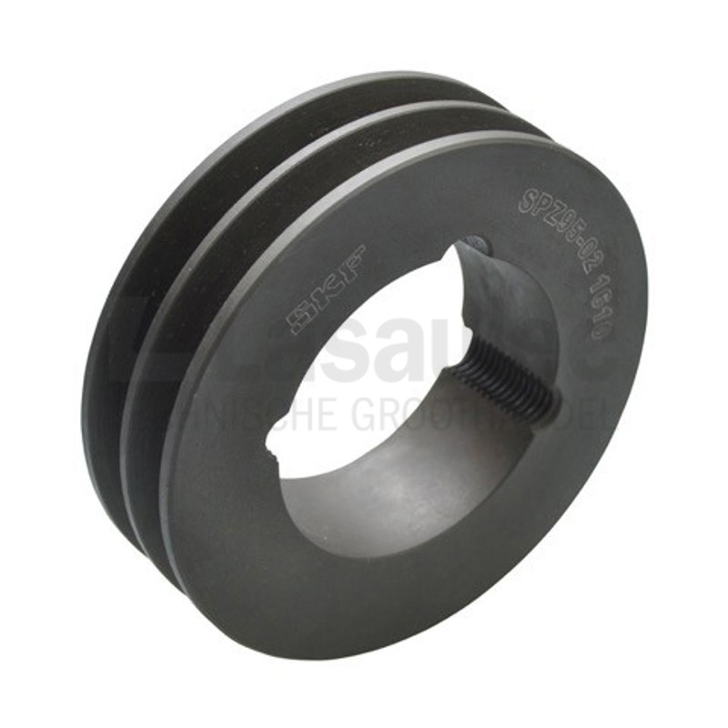 De riemschijf is gemaakt van gietijzer of gietstaal voor structurele sterkte en stabiliteit. De groef van de schijf volgt de standaard V‑profielen (zoals SPA, SPB of andere compatibele profielen). De schijf is geboorde of voorzien van een conische boring die passend