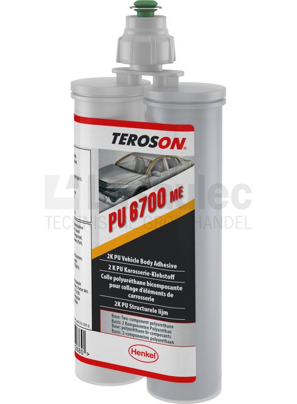 TEROSON PU 6700 ME is een 2-componenten polyurethaanlijm voor het verlijmen van diverse materialen, zoals roestvrij staal, aluminium en andere metalen, kunststoffen, hout en gelakte oppervlakken (niet aanbevolen voor PP en PE). Geen H351-risicozin dankzij MicroEmission-eigenschappen. De kleefvrijtijd bedraagt 30 min.