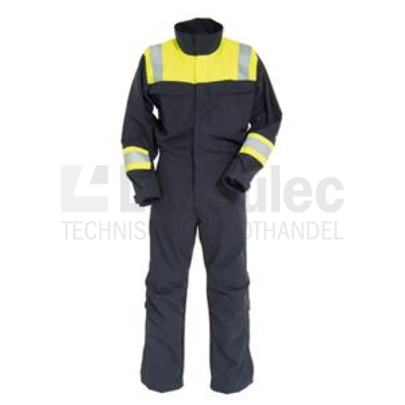 Vlamvertragende overall met verhoogde zichtbaarheid in een licht en comfortabel doek met een hoge scheurweerstand. Verdekte ritssluiting. Borstzakken met klep. Steekzak met extra insteek. Verstelbare tailleband. Grote rugplooien voor extra bewegingsruimte. Reflectie op de schouders en mouwen. Geheel metaalvrij.