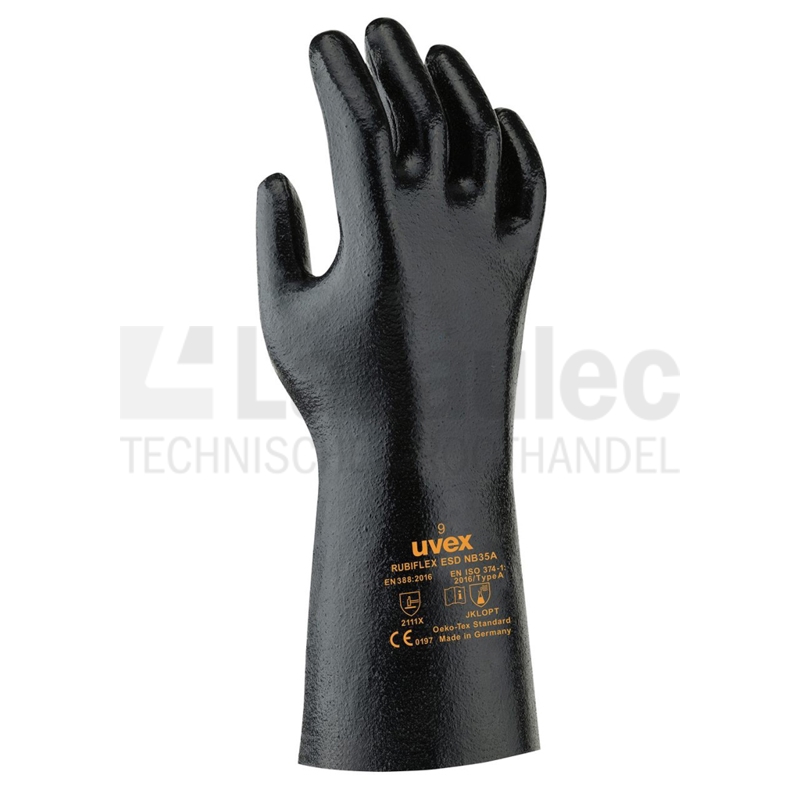 Chemicaliënbestendige handschoen,licht en flexibel, voor werkzaamheden waar bescherming tegen chemicaliën moet worden gecombineerd met hoge elektrische geleiding. Geschikt voor gebruik in explosiegevaarlijke zones en ESD-zones door een zeer lage doorgangsweerstand die kleiner is dan 10^8 Ohm. NBR coating van 0,4mm.