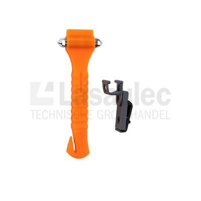 Dubbele hamer met geharde punten om ramen in enkele seconden te verbrijzelen. Ingebouwd, vlijmscherp Solingen mes voor het doorsnijden van gordels. Door zijn fluorescerende kop is de noodhamer in het donker altijd makkelijk te vinden.