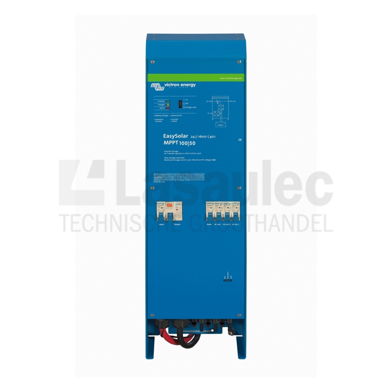 Acculader/omvormer, combineert een MPPT zonne-laadcontroller, een omvormer/lader en wisselstroomverdeling in één behuizing. Het product is eenvoudig te installeren, met een minimum aan bedrading. Tot drie sets PV-panelen kunnen met drie sets MC4 (PV-ST01) PV-stekkers worden aangesloten. De MPPT laadcontroller en de MultiPlus omvormer/lader delen de gelijkstroom-accukabels (meegeleverd). De accu's kunnen worden opgeladen met zonne-energie (BlueSolar MPPT) en/of met wisselstroom (omvormer/lader) via het elektriciteitsnet of een reeks aggregaten. De wisselstroomverdeling bestaat uit een aardlekschakelaar (30mA/16A) en vier wisselstroomuitgangen die van twee 10A-en twee 16A-contactverbrekers zijn voorzien. Een 16A-uitgang wordt aangestuurd door de wisselstroomingang: deze wordt alleen ingeschakeld als er wisselstroom beschikbaar is. De unieke PowerAssist-technologie beschermt het apparaat of de aggregaatvoeding tegen overbelasting door, indien nodig, extra omvormvermogen toe te voegen.