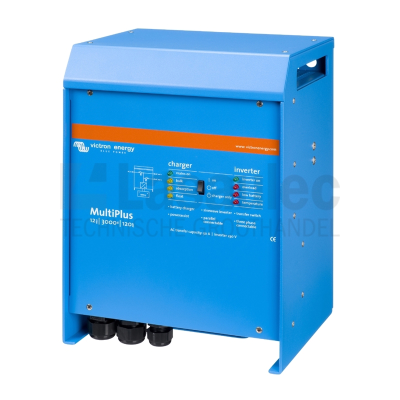 Acculader/omvormer, neemt de voeding van de aangesloten belastingen over in het geval van stroomuitval of als de wal-/aggregaatstroom wordt onderbroken. Dit gaat zo snel (in minder dan 20 milliseconden) dat computers en andere elektronische apparaten ongestoord kunnen blijven functioneren. De tweede uitgang wordt alleen actief als er wisselspanning beschikbaar is bij één van de ingangen van de MultiPlus. Belastingen die de accu niet mogen ontladen, zoals een boiler, kunnen op deze uitgang worden aangesloten (tweede uitgang beschikbaar bij modellen van 3 kVA en meer). Tot zes Multi's kunnen parallel geschakeld worden om een groter vermogen te kunnen leveren. Zo kan met zes 24/5000/120 eenheden bijvoorbeeld een uitgangsvermogen van 25 kW/30 kVA met 720 A laadvermogen worden bereikt. Naast de parallelle schakeling kunnen drie eenheden van hetzelfde model worden geconfigureerd voor drie-fase uitgang. Maar dat is nog niet alles: tot 6 sets van drie eenheden kunnen parallel worden geschakeld voor een omvormervermogen van 75 kW/90 kVA en een laadcapaciteit van meer dan 2000 A.