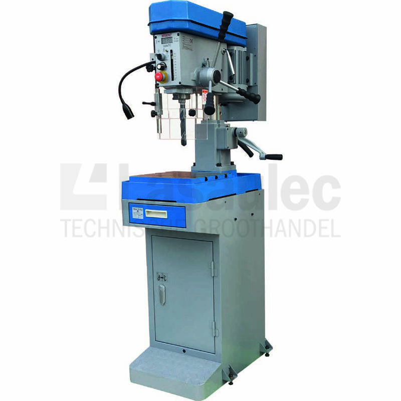 Wordt standaard geleverd op onderzetkast. Professionele kwaliteit, een starre constructie en onderhoudsarm. De boorkop is in hoogte verstelbaar, de kolom zakt in de onderzetkast. De machine is rijk uitgerust met onder andere, machineverlichting met aan/uit schakelaar, instelbare diepteaanslag, tapfunctie tot M10 en variabel toerental met digitale aflezing. Met een simpele handomdraai wordt de machine in tapfunctie gezet en draait deze linksom terug.