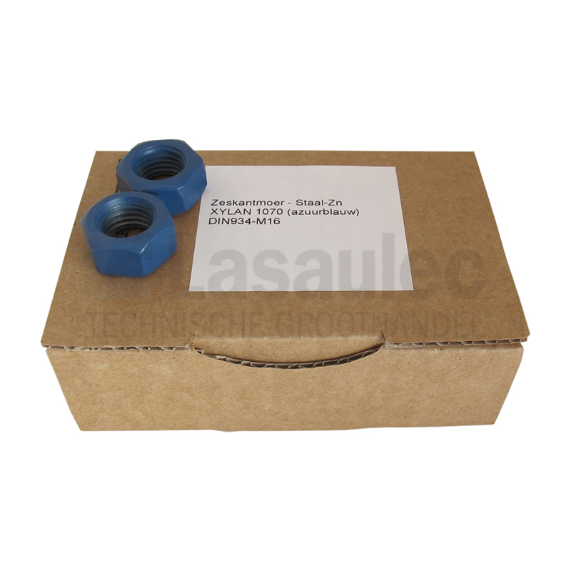 Zeskantmoer in DIN934 uitvoering, voorzien van metrische schroefdraad en Xylan coating volgens ISO 4042.