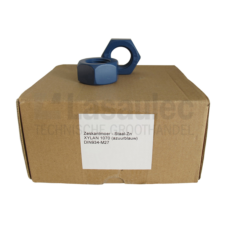 Zeskantmoer in DIN934 uitvoering, voorzien van metrische schroefdraad en Xylan coating volgens ISO 4042.
