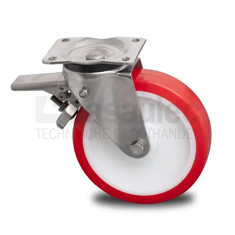 Zwenkvork van diepgetrokken elektrolytisch verzinkt plaatstaal en wielrem Zwenkkop met diepgroef-kogellager en uitgevoerd met hoogwaardig kwaliteitsvet geschikt voor extreme temperaturen.